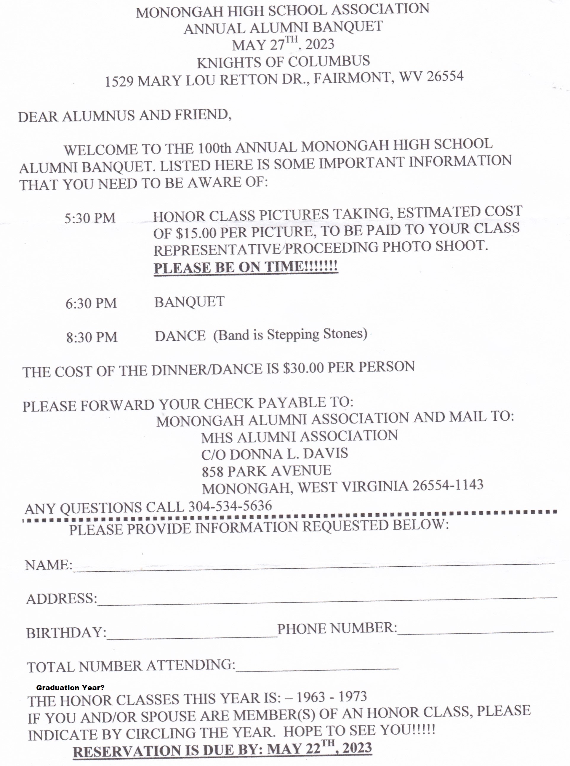 I am trying to compile a list of Lions who definitely will be coming to the 100th Monongah High Alumni Banquet on Saturday, MaY 27.  If your name is NOT on the list, email John Olesky at jo4wvu@neo.rr.com or post on John Olesky Facebook page. List your graduation year. And full name of your guest, if any, and graduation year IF he or she is a Monongah High graduate. It's the 100th Banquet of the longest-running high school reunion in West Virginia history so we want as many people as possible to show up. I'll be there.  Look me up: John Olesky, Class of 1950. I have a frame with 2,500 revolving photographs, including more than a thousand with faces of Lions in the photos. Stop by and see if you're in some of them. Let's make this the greatest MHS reunion since Greta Martin Mike's first reunion 1922! Be there or be square.  I will be taking and posting photos of everyone there that I can get to come to my table, too, for a June article on this blog. I have 43 names...